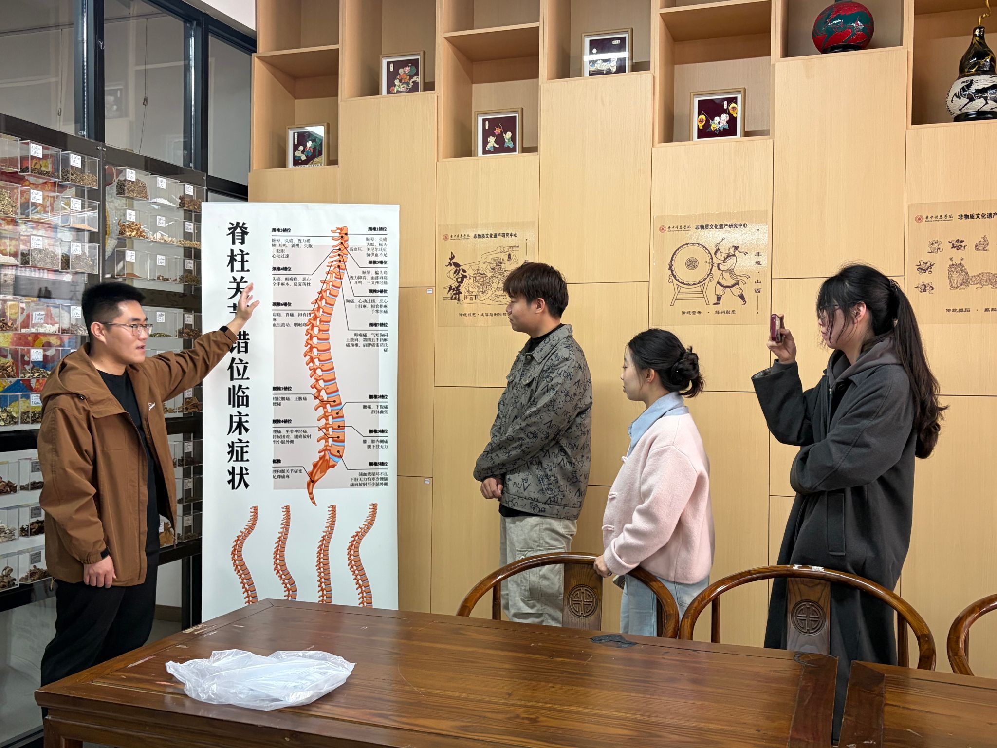 活动伊始,“摸骨正脊术”非遗传承人郭子龙老师在人体骨骼图前系统讲解颈椎、腰椎的生理结构与常见体态问题:“长时间低头姿态看手机和电脑,会导致颈部气血运行受阻,依据‘动静结合、以动养正’的养生原则,应在久坐后适当活动颈部,通过点按风池、肩井等穴位,可有效疏通颈部经络气血,缓解紧张状态。”郭老师边讲述骨骼错位的形成机理边提醒学生们,学生们跟着调整站姿和体态,现场互动热烈。