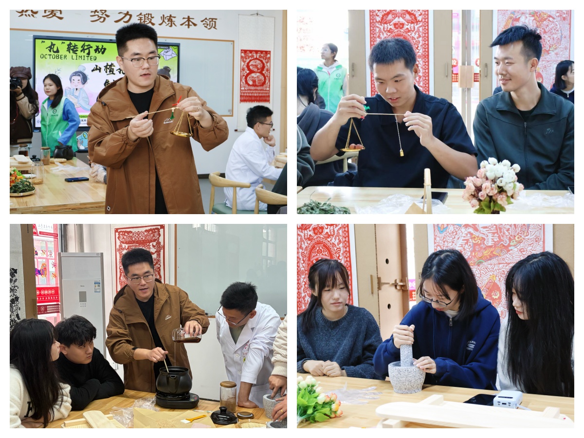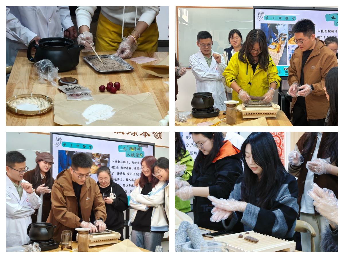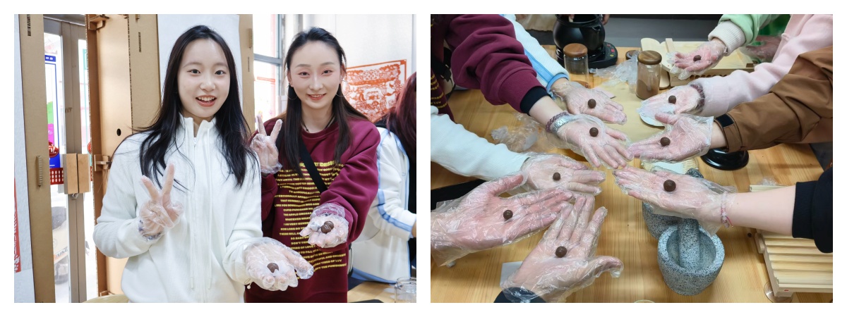 在紧锣密鼓的搓制养生山楂丸环节中,从称量药材到搓制药丸,每一步都需细致操作。学生非遗研究员梁新月感慨道:“亲历捣药、揉面、搓丸的山楂丸制作工序,才明白小小药丸里藏着药材精准配比的中医药养生智慧。”在“山楂蜂蜜健胃丸”的丰富口感层次、中医养生知识与药丸搓制技艺中,“非遗+专业”的深度融合使学生们深刻感受到中医药文化的博大精深,也真切感知到我校专业教育落地生根的实践力量。