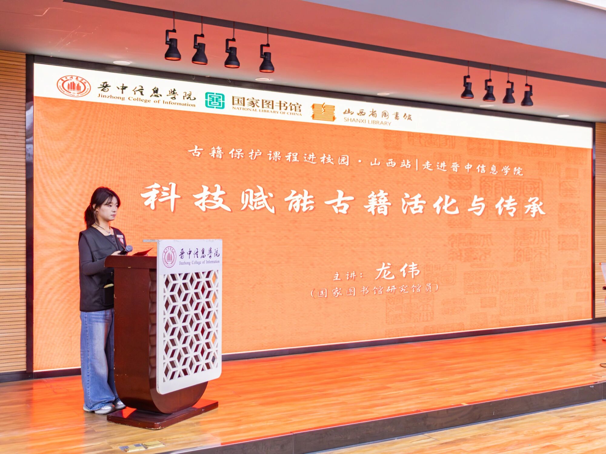 为进一步丰富校园非遗文化品牌活动,推动中华优秀传统文化在青年一代中的传承与创新,由山西省图书馆主办、晋中信息学院承办的“古籍保护课程进校园”山西站活动于近日成功举办。本次活动特邀国家图书馆(国家古籍保护中心)研究馆员,全国文献影像技术标准化技术委员会电子技术分会秘书长、中国古籍保护协会团体标准研究专业委员会委员龙伟老师,为我校师生带来了一场主题为“科技赋能古籍活化与传承”的精彩专题讲座。