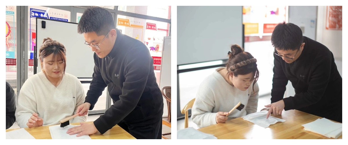 在详细讲解完拓印的历史渊源与文化价值后,教师和学生非遗研究员陈思宇开始现场示范“捶拓留形”与“匀墨显纹”技法:先将一张宣纸轻轻敷在刻有晋商古建纹样的模板上,并喷水来确保纸张与模板紧密贴合,这一步被称为“敷纸入槽”;接着用打刷在宣纸上轻轻敲拓,力度均匀且适中,让纸张逐渐呈现出精美图腾的纹样,此为“轻敲拓形”;最后拿起墨刷,蘸取适量赤色墨汁在宣纸上涂抹,随着墨色的渗透,原本隐约的纹样逐渐清晰起来,“匀墨留痕”工序完成,一幅拓印作品便呈现在大家眼前。