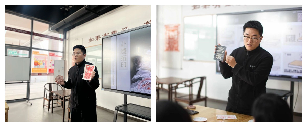 活动现场,非遗研究中心教师郭子龙首先向同学们介绍了拓印技艺的历史脉络:拓印又称“传拓”“捶拓”,是利用宣纸和墨汁印制文字、图案的传统技法。本次活动以晋商古建筑纹样为创作核心,将拓印传统技法与晋商文化中的吉祥图案深度融合。