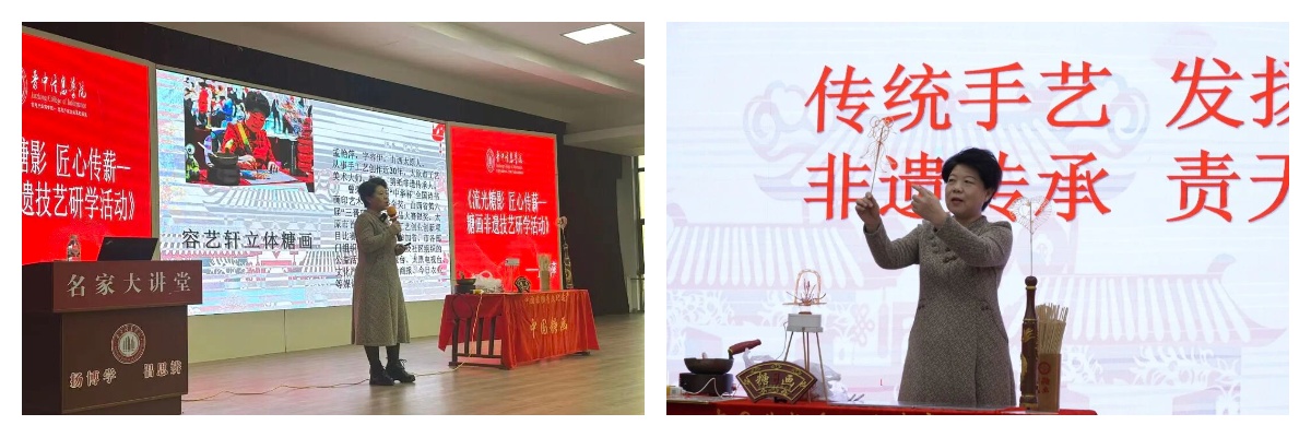 活动伊始,孟艳萍老师并未停留在知识的简单灌输,而是通过生动的语言、详实的图文资料,从糖画的历史渊源、文化内涵及其在民间的趣闻轶事入手,系统介绍了这门以糖为墨、以勺为笔的民间艺术。随后,她详细讲解了糖画制作所需的各类工具及其在制作过程中的作用,并展示了她的多件代表作品。从栩栩如生的飞禽走兽到活灵活现的人物故事,一件件精美的糖画作品让在场师生无不惊叹于传统手工艺人的精湛技艺和无限巧思。