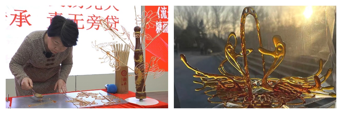 最令人期待的环节莫过于孟老师的现场演示。在热烈的掌声中,她取适量蔗糖,置于锅中,以文火慢慢熬煮。待糖浆融化、色泽变得金黄透亮时,她手持铜勺,手腕轻转,糖浆如丝般从勺中倾泻而出,在光滑的青石板上游走、盘旋、勾勒。不一会儿,一条鳞爪分明、威风凛凛的糖龙便跃然“石”上,引得师生们阵阵喝彩。这种“手把手”的技艺展示,让抽象的非遗技艺变得可感可知,极大地提升了学生的参与度和体验感。
