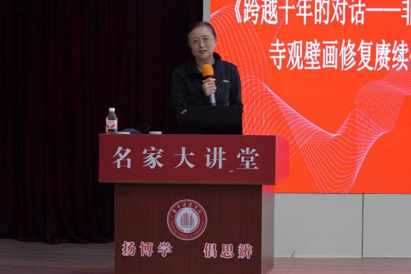 讲座中,苗主任着重解读壁画修复的核心准则,强调修复工作必须严格恪守 “不改变原状、最小干预、保存历史信息” 的专业要求。她指出,非遗作为活态传承的文化实践,是壁画保护修复的核心技术支撑;修复者欲做好壁画修复,必先解构古代画匠的创作密码 —— 既要领会 “吴带当风” 的线条韵律与笔墨意趣,亦要理解传统五色对应五行的色彩寓意与文化内涵,唯有深悟这些藏于壁画中的传统 “文化语法”,方能实现贴合原作、“不干预原意” 的恰当修复,让千年壁画的历史与艺术价值得以真实赓续。