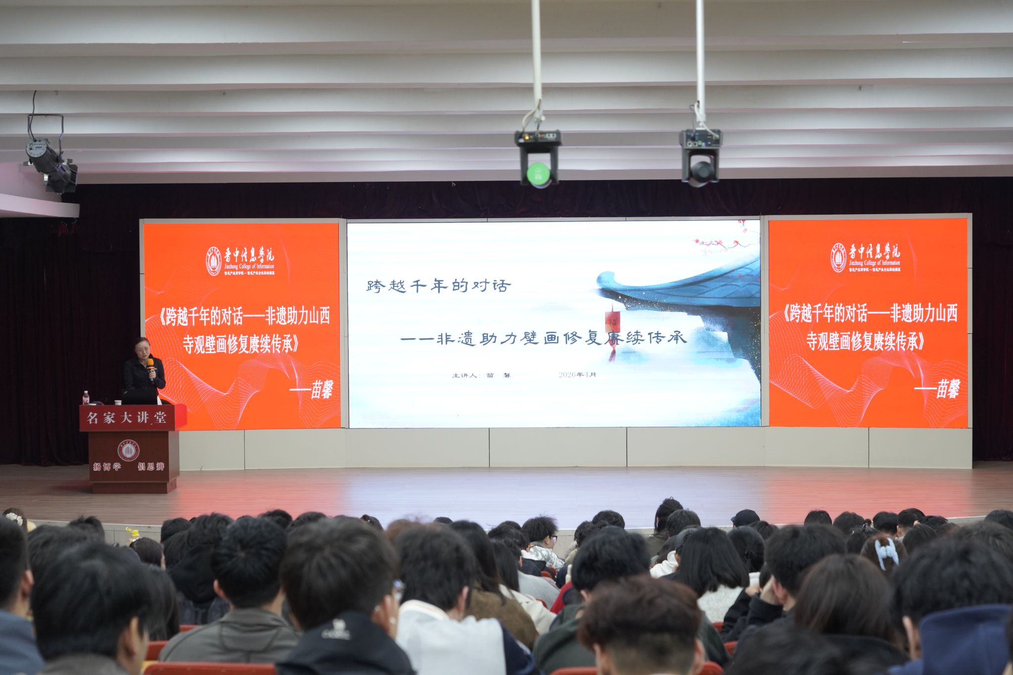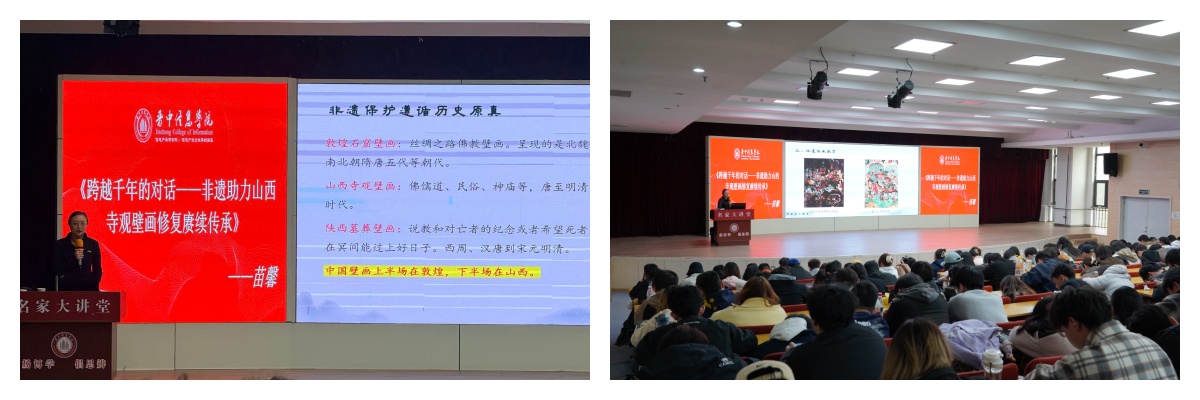 晋中信息学院非遗研究中心非遗系列讲座第08讲精彩开讲!非遗研究中心、艺术传媒学院特邀副研究馆员、太原市文化馆非遗保护部主任、省级非遗项目评审专家苗馨,以《跨越千年的对话:非遗助力山西寺观壁画修复赓续传承》为题,深挖非遗在文物保护中的独特价值,探索传统技艺与壁画修复的创新融合路径,为师生带来一场兼具专业深度与文化温度的分享,让千年壁画的保护与传承在非遗智慧中焕发新活力。